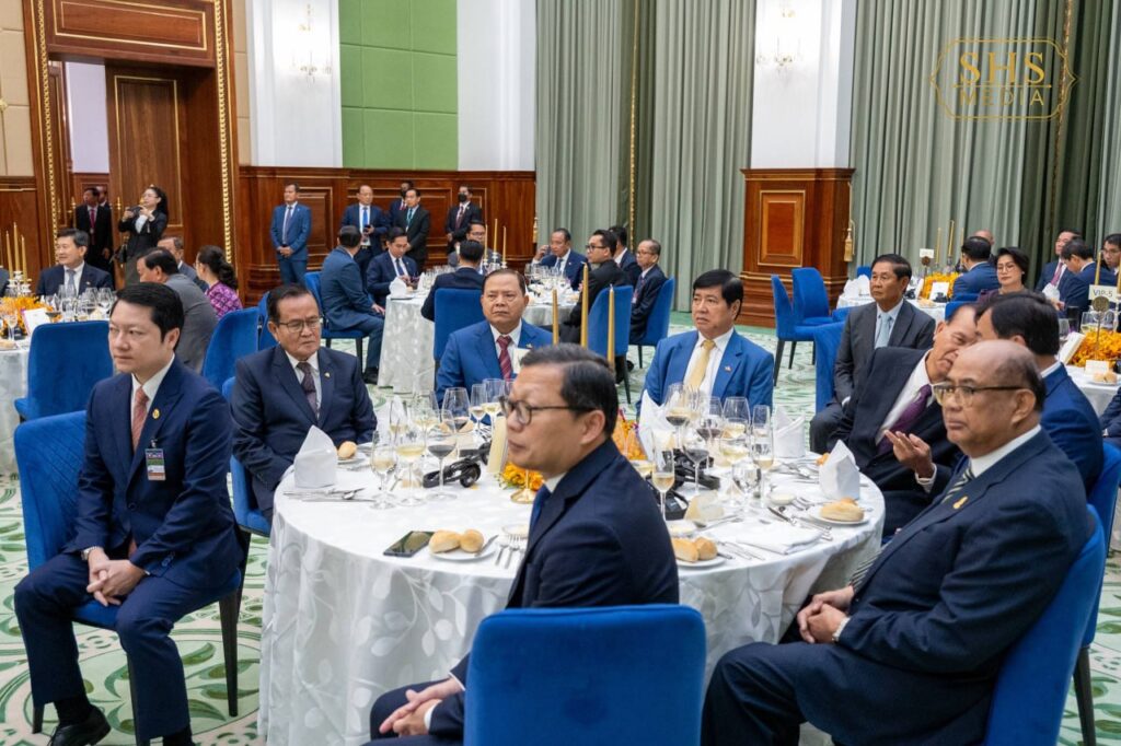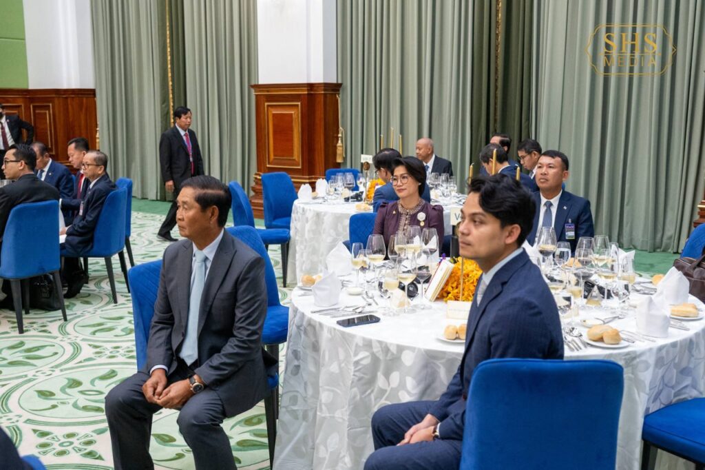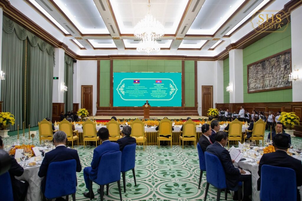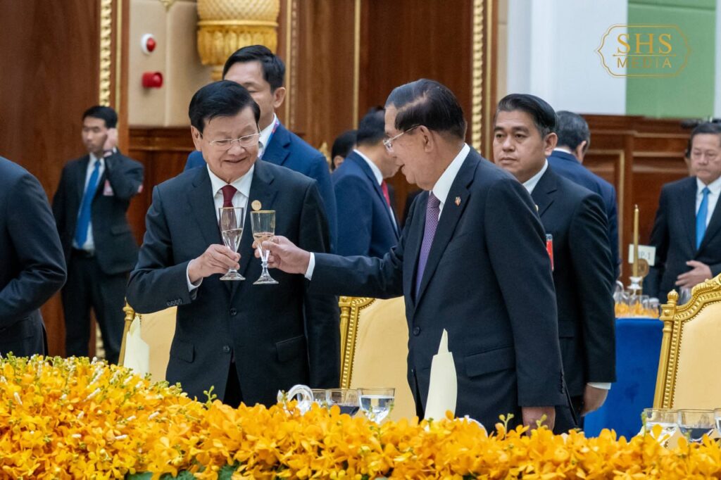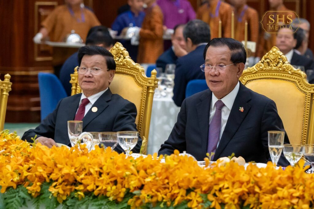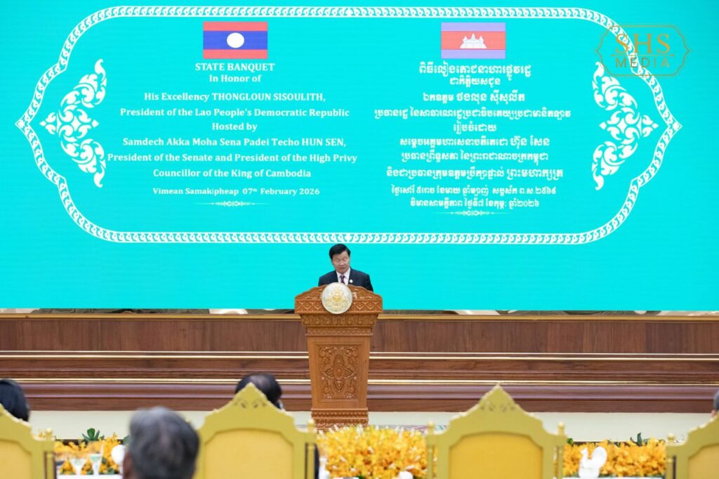 សម្តេចអគ្គមហាសេនាបតីតេជោ ហ៊ុន សែន ប្រធានព្រឹទ្ធសភានៃព្រះរាជាណាចក្រកម្ពុជា ក្នុងព្រះបរមនាម ព្រះករុណា ព្រះបាទសម្តេចព្រះបរមនាថ នរោត្តម សីហមុនី ព្រះមហាក្សត្រនៃព្រះរាជាណាចក្រកម្ពុជា បានរៀបចំពិធីលៀងភោជនាហារផ្លូវរដ្ឋជាកិត្តិយស ជូន ឯកឧត្តមបណ្ឌិត ថងលុន ស៊ីសុលីត(Thongloun Sisoulith) អគ្គលេខាធិការបក្សប្រជាជនបដិវត្តន៍ឡាវ និងជាប្រធានរដ្ឋនៃសាធារណរដ្ឋប្រជាធិបតេយ្យប្រជាមានិតឡាវ ក្នុងឱកាស ឯកឧត្តម និងគណៈប្រតិភូ អញ្ជើញបំពេញទស្សនកិច្ចផ្លូវរដ្ឋនៅព្រះរាជាណាចក្រកម្ពុជា នាថ្ងៃសៅរ៍ ៥រោច ខែមាឃ ឆ្នាំម្សាញ់ សប្តស័ក ព.ស. ២៥៦៩ ត្រូវនឹង ថ្ងៃទី៧ ខែកុម្ភៈ ឆ្នាំ២០២៦។