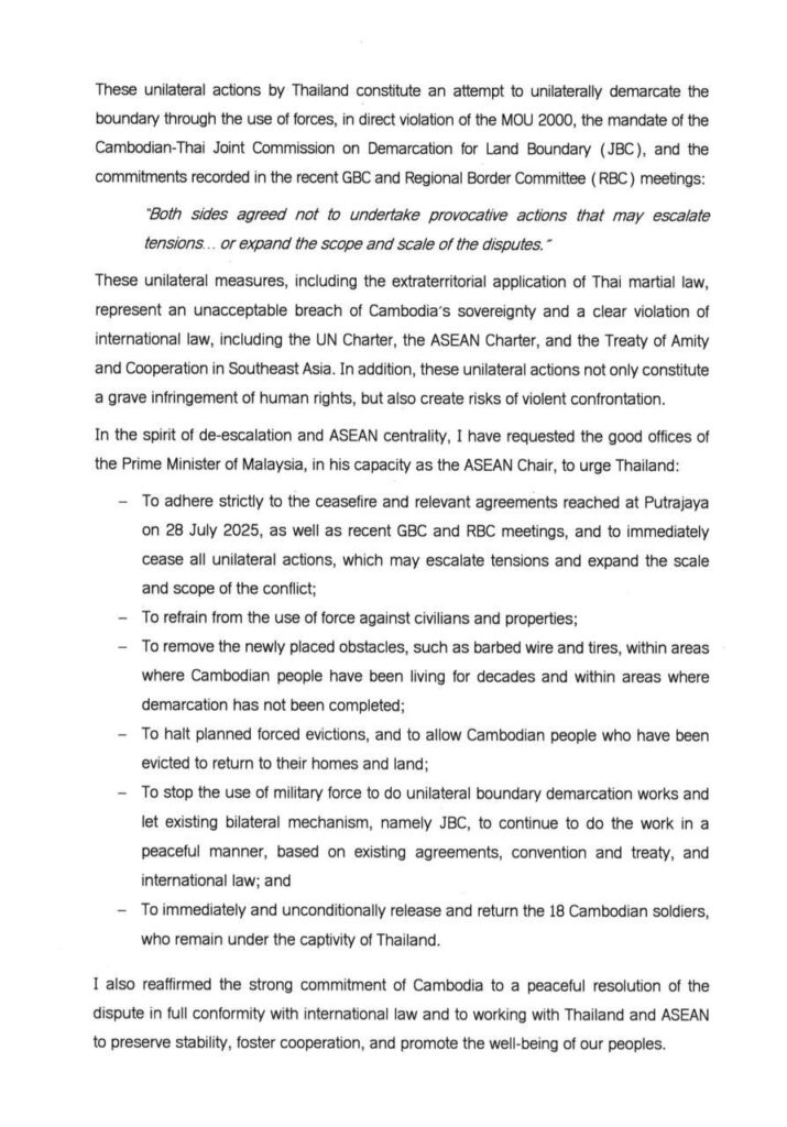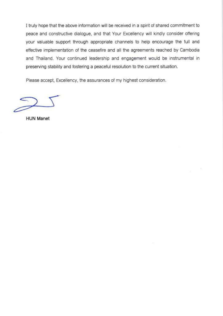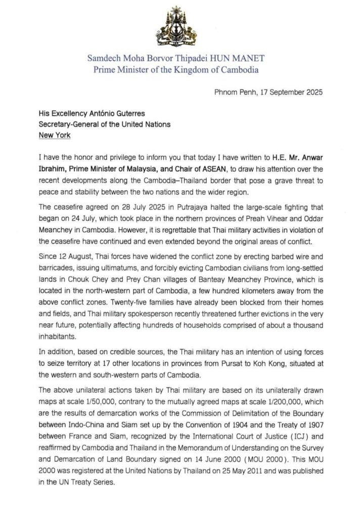 លិខិតរបស់ សម្តេចមហាបវរធិបតី ហ៊ុន ម៉ាណែត នាយករដ្ឋមន្ត្រីនៃព្រះរាជាណាចក្រកម្ពុជា ផ្ញើជូន ឯកឧត្តម António Guterres អគ្គលេខាធិការអង្គការសហប្រជាជាតិ ពាក់ព័ន្ធនឹងការវិវឌ្ឍនៃស្ថានការណ៍ព្រំដែន កម្ពុជា-ថៃ។